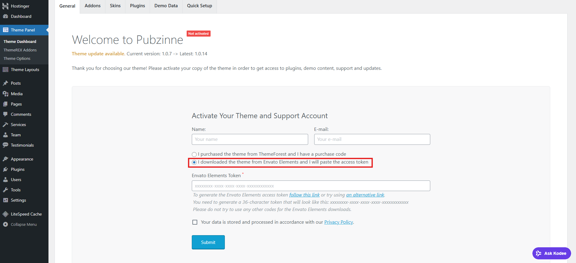 Certain themes are built by authors who require an Envato Elements–style activation inside the theme panel.